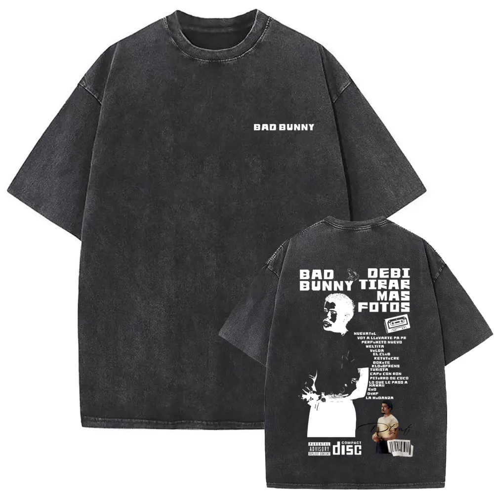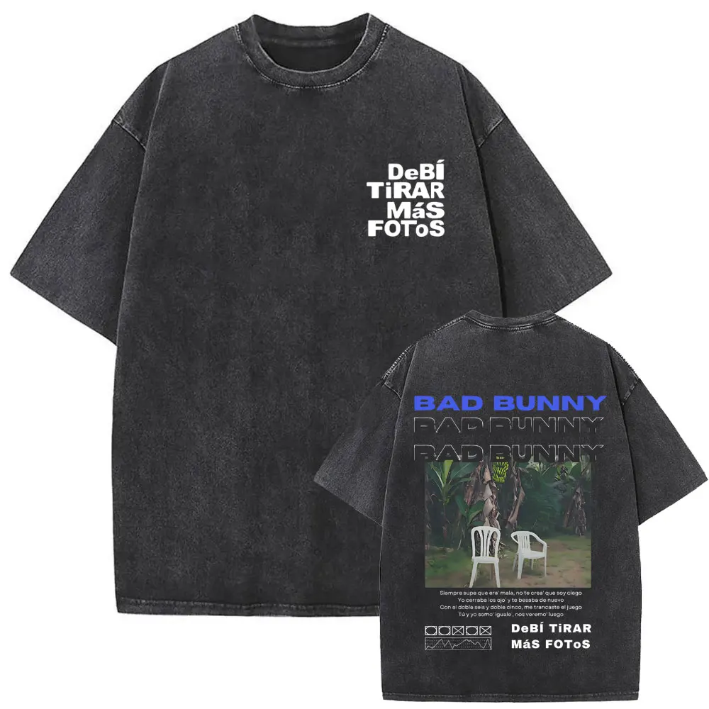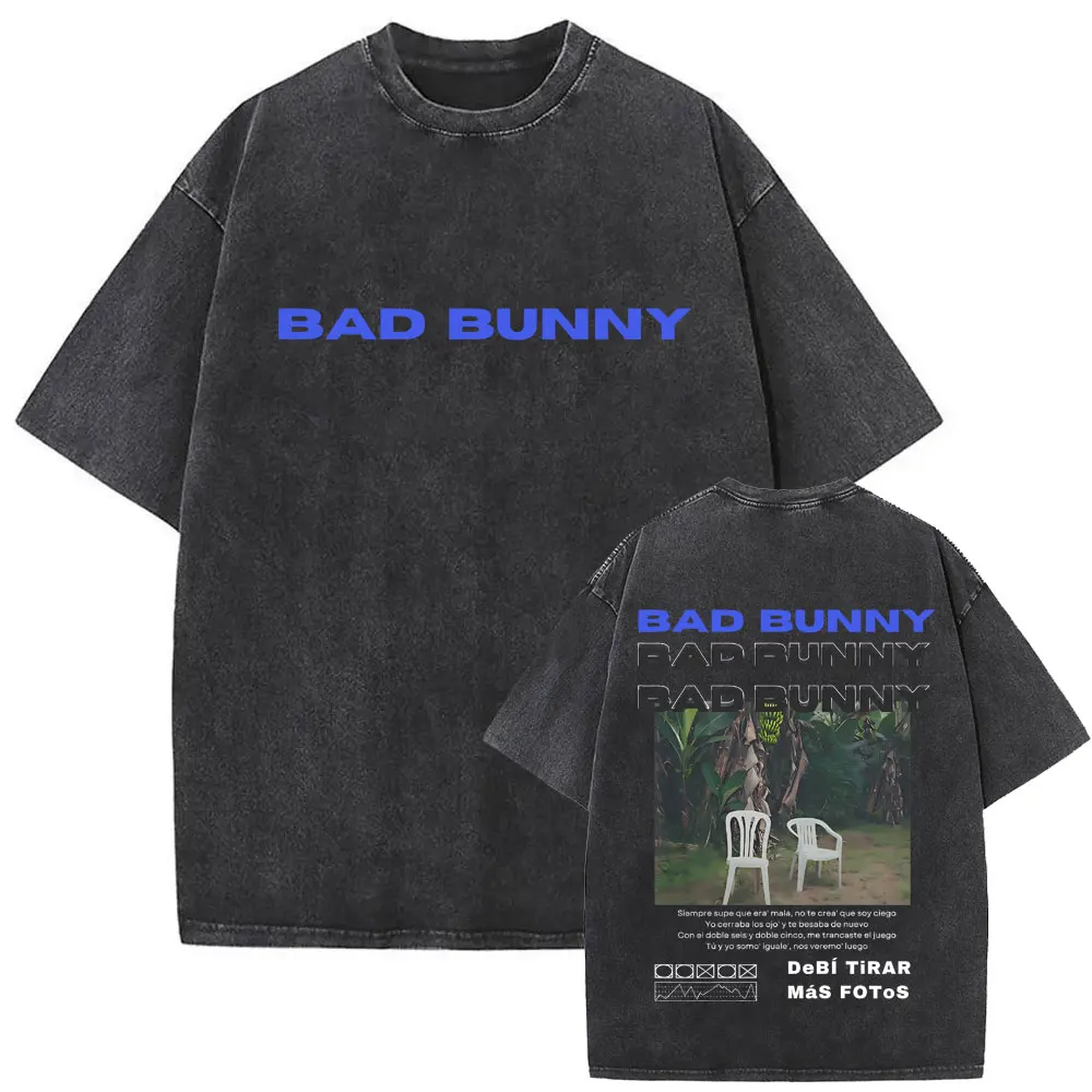 Step up your style game with the Bad Bunny Debi Tirar Mas Fotos Tee! This trendy graphic t-shirt showcases a playful design inspired by the iconic artist Bad Bunny, making it a must-have for music fans. The vintage wash adds a unique touch, perfect for expressing your individuality.